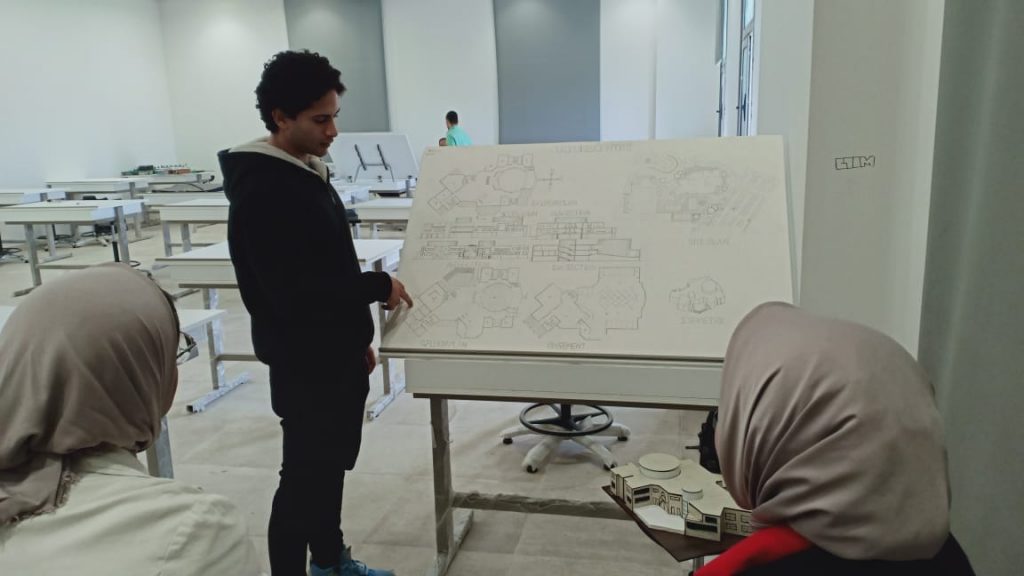 The jury committees’ strategy depends on directing students and encouraging them to conduct the study, explore, and think, as well raising concerns, sharing their perspectives, and providing solutions. In order to connect academic study and professional requirements and exchange design perspectives, they represent a variety of schools and architectural philosophies and integrate students into the professional environment by imitating the professional market. The students managed to deal with and concentrate on making connections between the academic courses and the practical aspects in order to give a chance to foster an environment that would inspire innovative, advanced ideas and help students improve their oral communication, listening and thinking abilities.